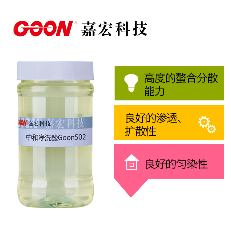 中和净洗酸Goon502,又称碱减量缓冲剂。本产品主要由高分子有机酸组合而成,有良好的渗透、络合、分散、缓冲作用,主要用于前处理、后处理过程中碱的中和分解作用。