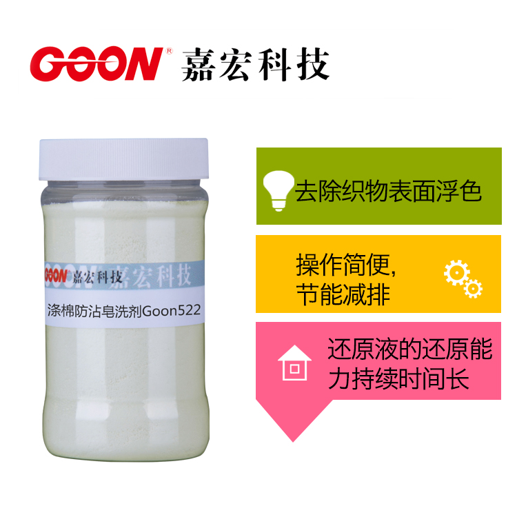 涤棉防沾皂洗剂Goon522适用涤纶及涤棉混纺织物染色后的还原清洗。浅色染色后可不排液,降低80℃~90℃直接加入本产品,调整工作液PH值为3-4,可达到良好的还原清洗效果。